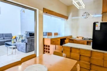 Une terrasse panoramique, une cuisine moderne (type mini-bar) et une toilette.